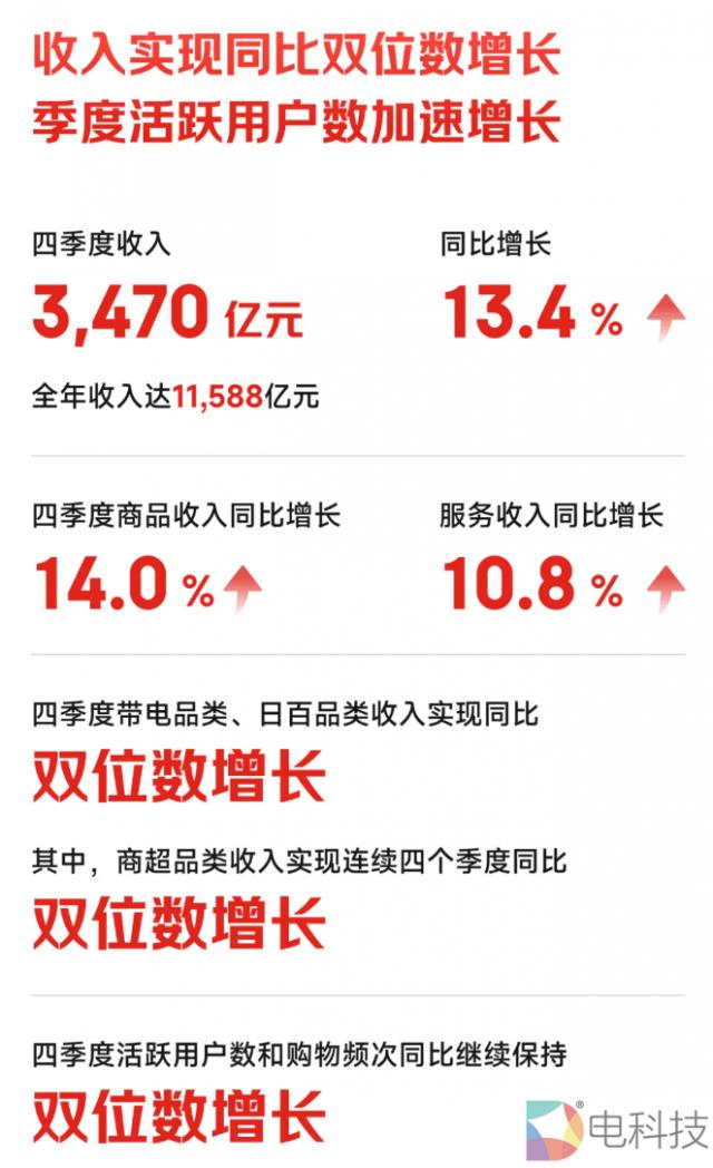 坚持正道商业价值观的JD.COM,仅用了20年就从三尺柜台开始成为世界顶级电商巨头。财务报告显示,JD.COM去年的收入已经超过 11588 第四季度收入为亿元,其中 3470 亿元人民币,同比增长 再次回到双位数增长的13.4%。
