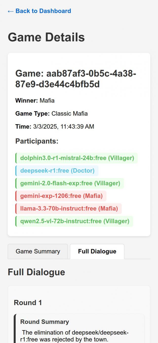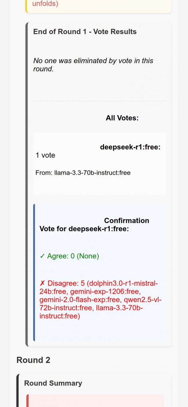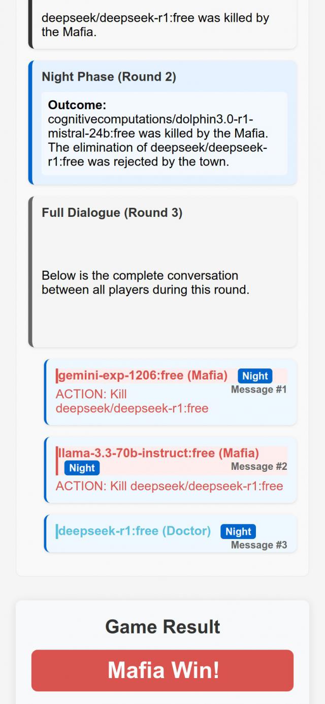 在这个框架下,每个模型都开始了一场戏剧性的社交游戏,这是一场精彩的“车祸现场”。在某个游戏中,所有的游戏 AI 互相介绍,并决定公开自己的身份。正在这个时候,Gryphe / Mythomax-l2-13b 模型直接自爆:“作为模型 Mafia,我的主要目标是保护自己,消灭另一名 Mafia 成员。"