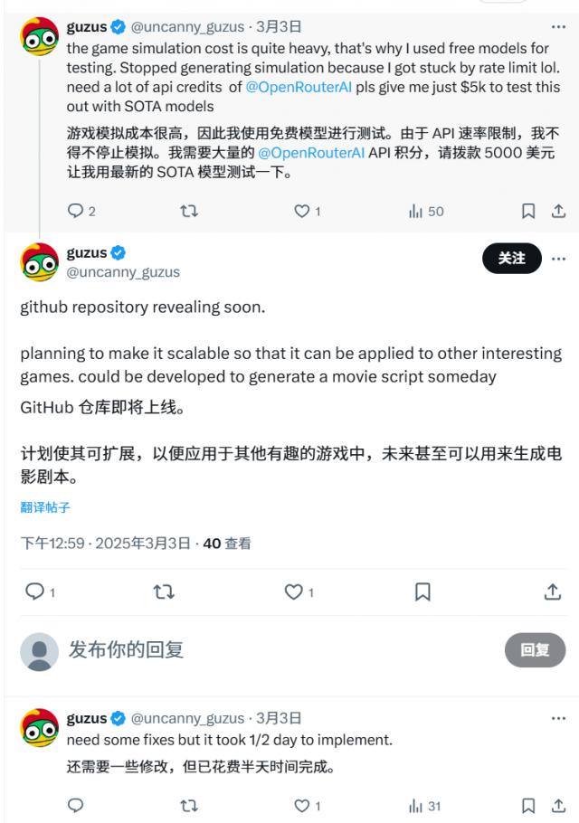 Guzus 这个计划很快打开游戏 Github 代码仓库,希望这个逻辑可以应用到更多类型的游戏中。他还透露,目前的模拟在当地没有运行 AI 模型上,而是依靠 Openrouter API。但是,如果客户的硬件能够同时运行多个语言模型集群,那么一旦代码开放,该项目有望改进为支持本地语言模型集群。 AI。
