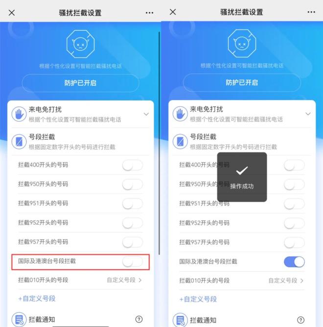 第二步:进入骚扰拦截设置界面,找到“国际和港澳台号段拦截”开关,点击打开。打开后会显示“操作成功”,系统会自动阻止你打这样的电话。