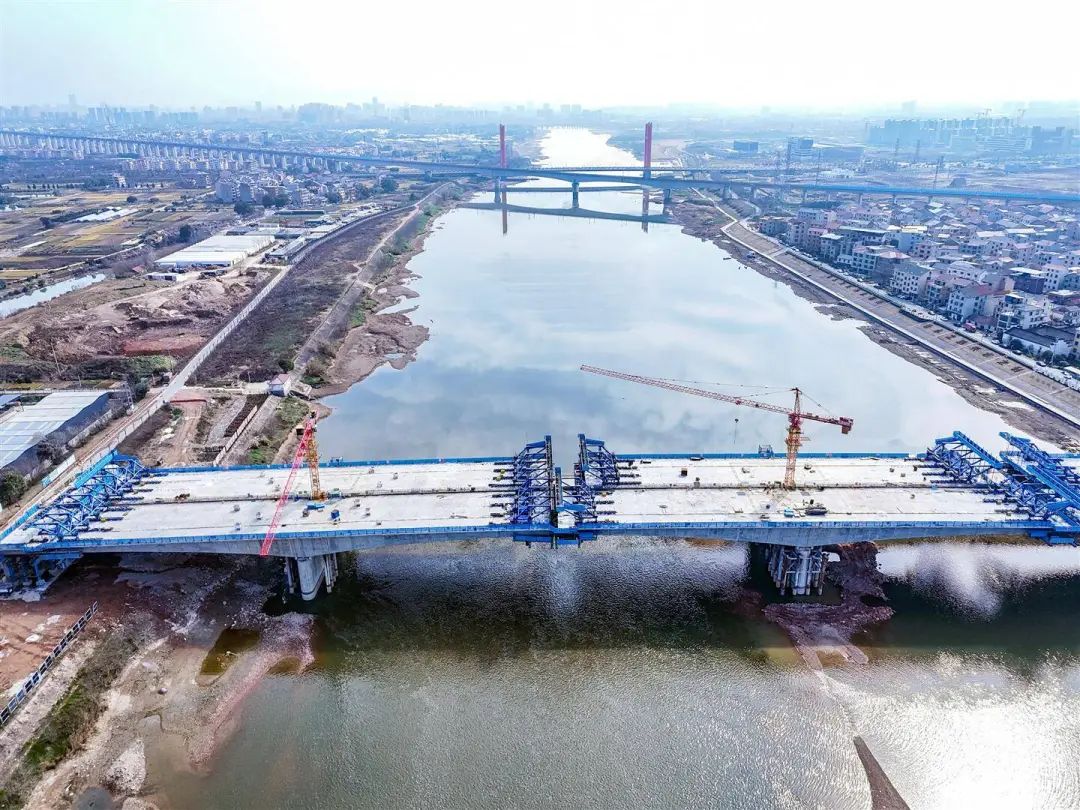 近日,华龙大桥作为婺城新区华龙南街北延工程施工现场的主要施工节点,已初具规模,桥面即将合龙。华龙大桥总长957米,桥宽39米,双向6车道。华龙大桥建成后,将与婺城大桥形成“双龙跨江”的趋势,成为金华江两岸发展的又一纽带。