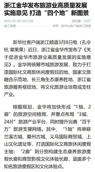 三月八日,新华社客户端发布了《浙江金华旅游高质量发展实施方案》 关注金华市发布《关于促进金华市旅游业高质量发展的实施意见》,打造“四地”新景象,统筹城市旅游发展,把文化旅游培育成支柱产业。