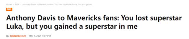 当我在独行侠职业生涯的第一场演出中提到扣分后对观众台大喊“我在这里”时,浓眉说:“我知道整个城市都因为卢卡(东契奇)的交易而沮丧。同时,我也知道我是什么样的球员。我是历史。 75 大球星。只是希望达拉斯球迷知道。‘我在这里,我会满足所有人。此时此刻我就在这里。“我知道你失去了卢卡这位超级明星,但是你也得到了我这位超级明星。
