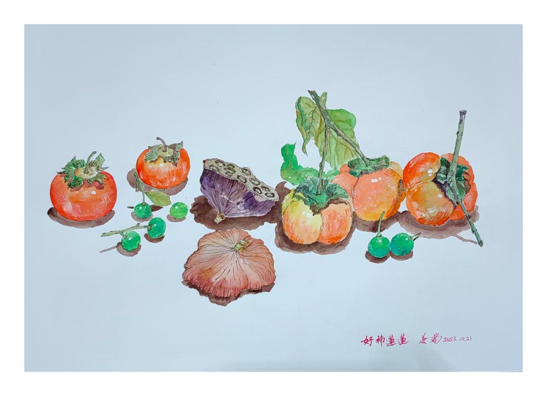 金黄色的柿子,棕色的莲花,这是丰收的喜悦。柿子,莲花有很好的寓意:一切顺利,好事连连。