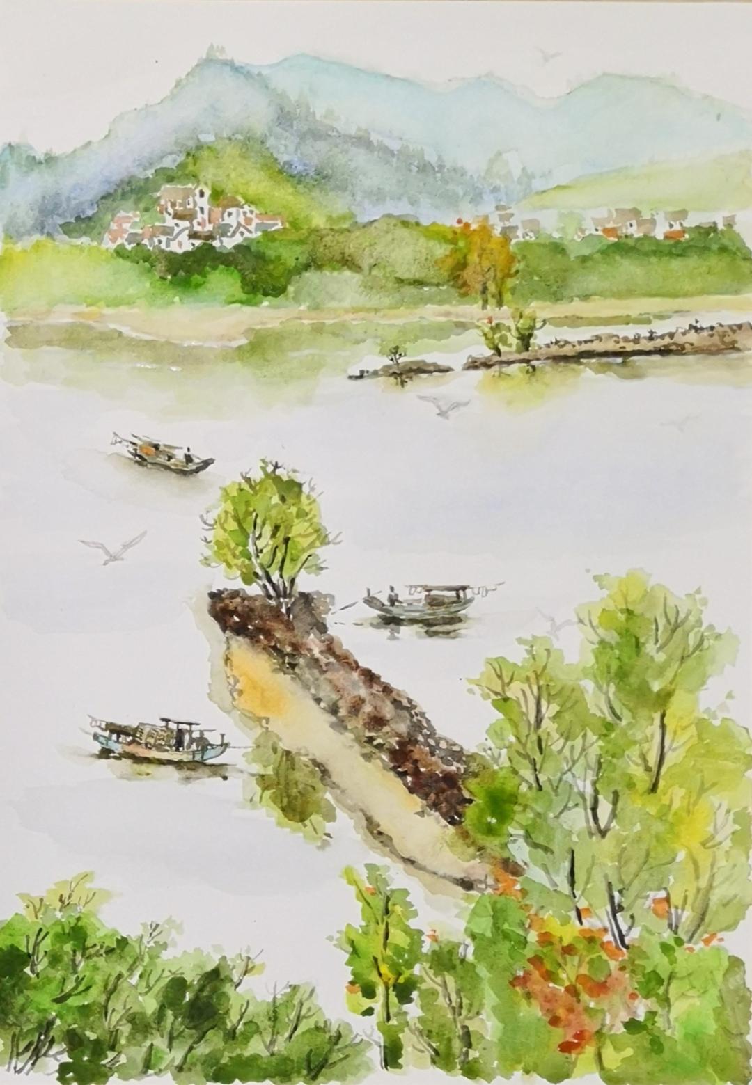三月春暖花开的季节,河上悠闲漂浮的渔船和远处古朴的房屋,生动地展现了自然之美和人文之美。