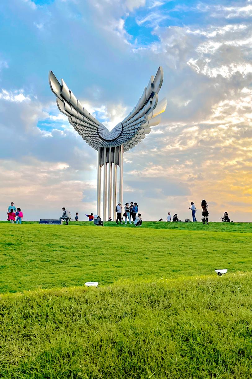 雕塑以苏州传统建筑的瓷砖为创作元素,通过错落有致的排列和夸张的艺术处理,看起来像一对伸展的翅膀,意思是双翼飞翔,双翼飞翔。