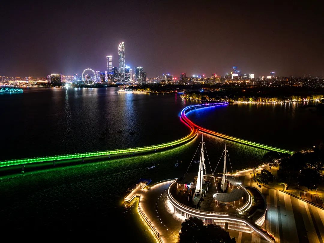 金水湾栈桥,长883米,是一座跨度很大的水上桥。俯瞰它就像一个大写的“人”字,蜿蜒曲折,像一道彩虹映在水面上。悠闲地走在这里,你可以一览金鸡湖的景色。