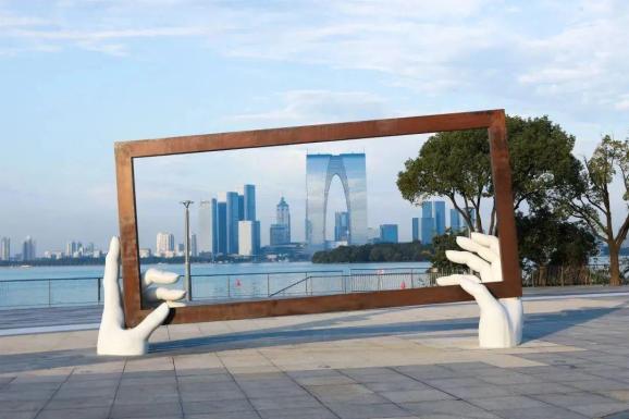 “入戏”是比利时艺术家费力克斯·鲁林创作的。底部的手不仅是“框架之手”,也是“关怀之手”。它包容苏城的文化和艺术,珍惜幸福的生活,用穿越历史的框架见证时代的变迁。接近它就像进入一个戏剧性的场景,一个永恒定格的瞬间与湖边的景观完美契合。