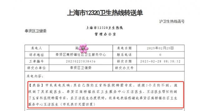 2025 年 2 月 25 日,上海市 12320 卫生热线收到一个特殊的电话,市民路先生致电,向奉贤区南桥镇社区卫生服务中心的家庭医生王洁表示衷心的感谢。路先生在预约上海五官医院特殊需求专家号时遇到了困难,并继续 5 在几乎放弃的时候,他想起了自己的家庭医生王洁,他几乎没有成功。