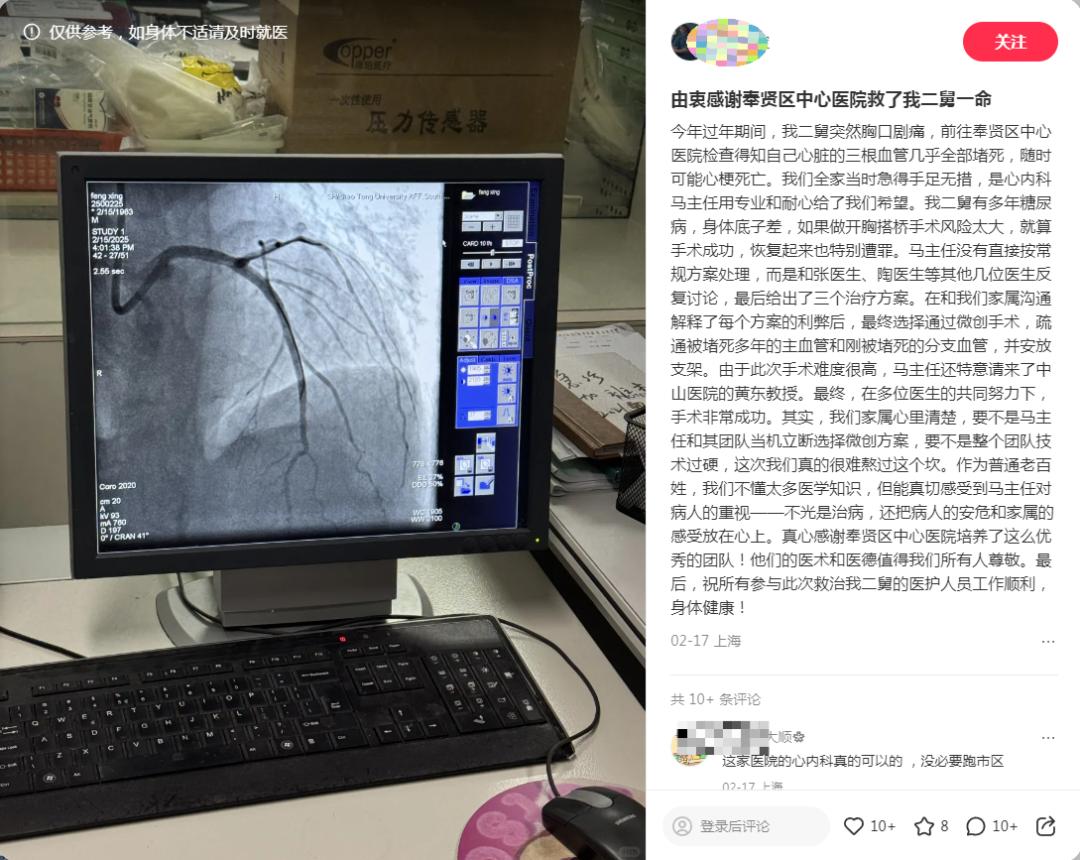 今年春节期间,一名患有多年糖尿病的患者在家突然胸部剧烈疼痛,被紧急送往奉贤区中心医院。经检查,发现患者心脏的三条主要血管几乎完全堵塞,情况紧急,随时可能引起心肌梗死,生命垂危。面对如此复杂的病情,家人一度陷入绝望。