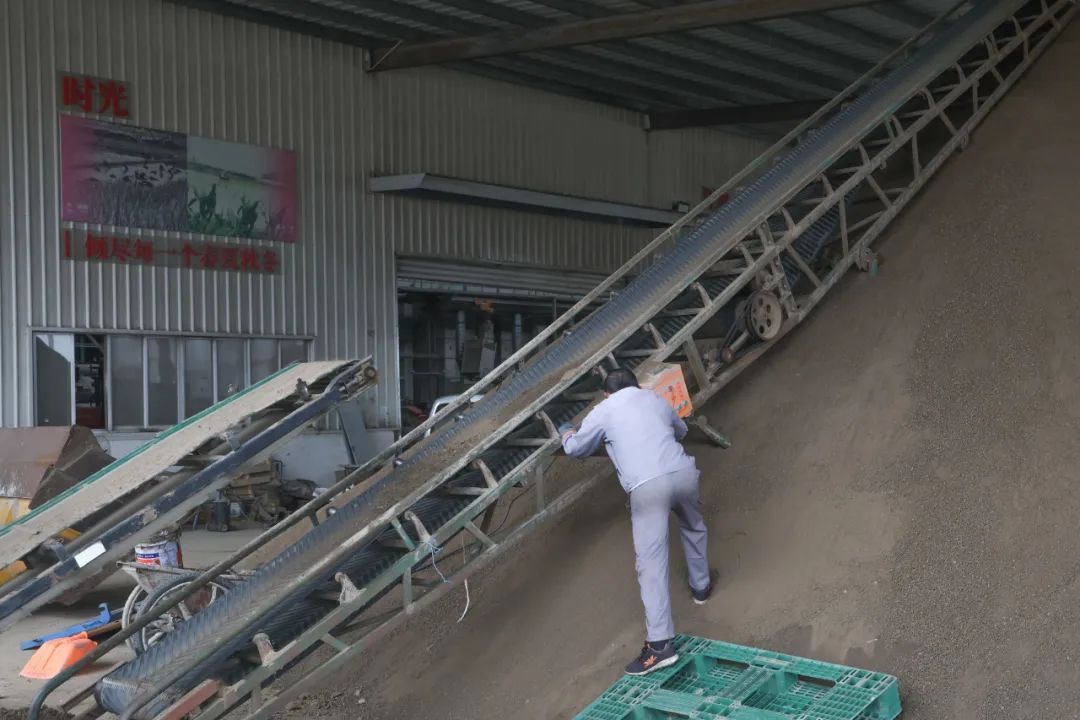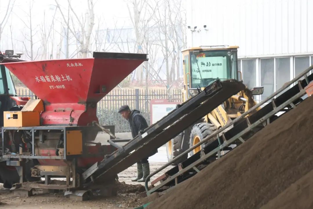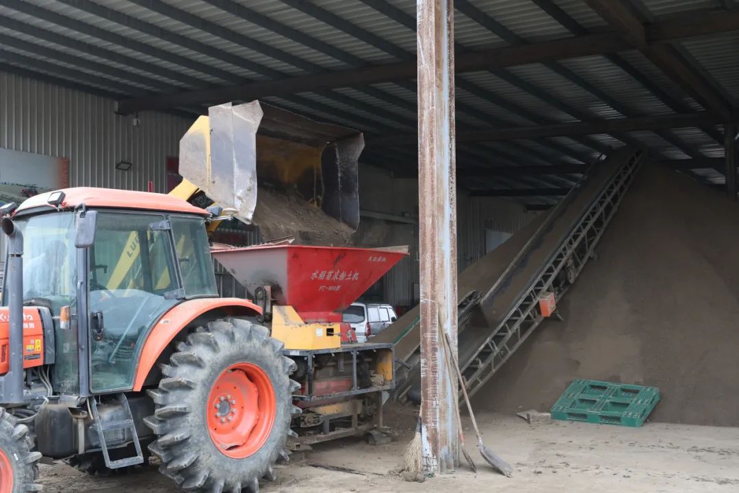 在现场,我们可以看到工作人员正在驾驶挖掘机,小心翼翼地将干燥结块的土块倾倒到粉土机的慷慨斗中。经过机器处理的细沙通过输送带送到一边,堆积成两座高大的“土山”。这座精致的“土山”是未来机械培育秧盘的必需品。