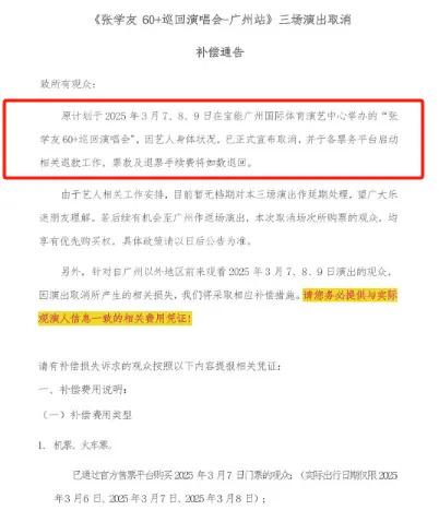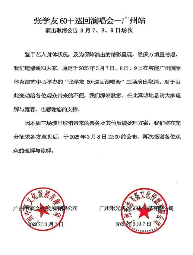 3 月 8 日,@禾光飞舞 就《张学友 60 巡回演唱会-广州站三场演唱会取消补偿公告:“可惜演唱会因为某种原因被取消,相关补偿方案已经发布到票务平台详情页。请登录票务账户查看具体补偿规则,完成后续流程。我们为您带来的不便深表歉意。感谢您的理解和支持!”