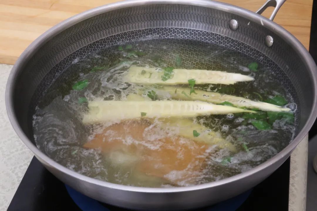 将春笋去皮,对半切,与豆干一起放入锅中煮熟。
