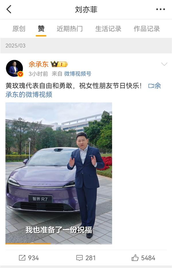 余承东微博祝女性节日快乐:刘亦菲喜欢