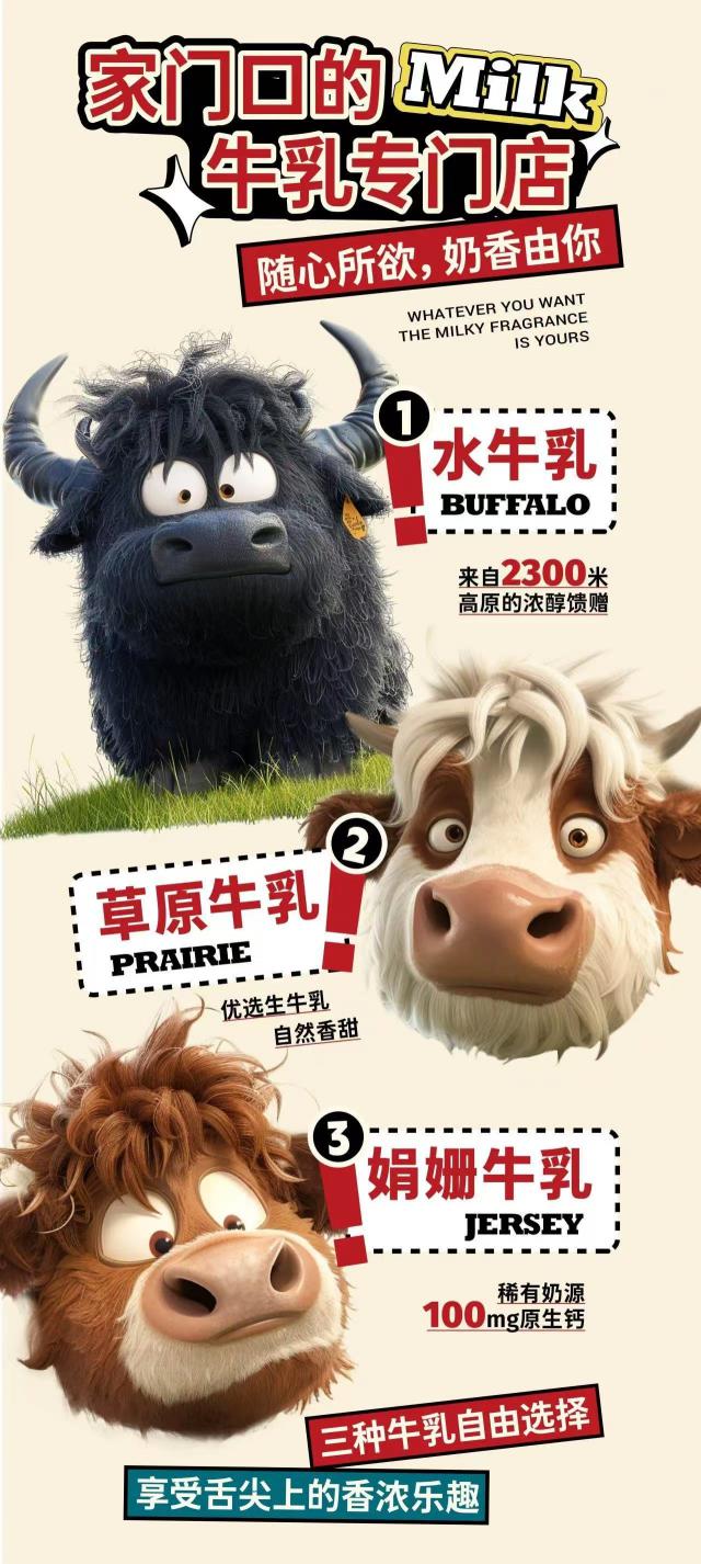 而且混在“牛奶专卖店”里的奶茶,只是其中的一个系列。正如它所倡导的,以“探索牛奶盒里的世界”为主线,赋予、承载和延伸更多的内容和内涵,牛奶作为“大自然赋予人类的白色血液”。也就是说,以“牛奶”为核心,以“一切都可以搭配”为特征,与匹配的内容物融为一体,不断延伸各种创新的饮用方式,如新鲜水果、植物、水果和蔬菜、谷物和咖啡,向消费者呈现“多元饮用牛奶”的理念和生活方式。