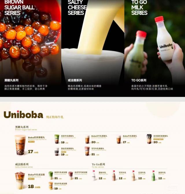 在茶饮界被称为“任天堂” Uniboba "(优尼波巴) 定位当前制茶行业的“牛奶专卖店”,不同于以不同种类的“茶”为主体的新中式茶的产品延伸。店内产品品种以“牛奶”为主,分别是奶茶系列、全法奶酪系列、仿泰国网络名人品牌 - 奶小子的花色奶系列(口味奶)。