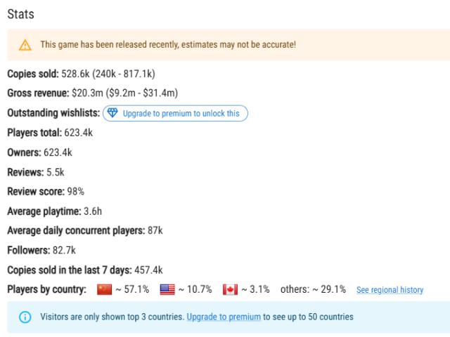 根据数据统计网站 gamalytic 资料显示,《双影奇境》中国玩家数量约占玩家总数。 美国和加拿大的57.1% 10.7% 和 3.1% 的占比位居 2、3 名。