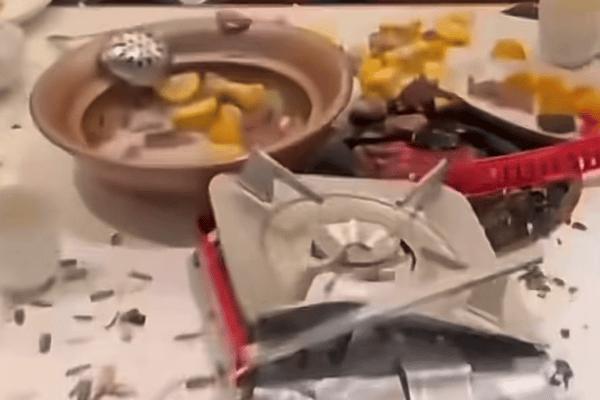 2023 年 4 月 27 日本,贵州毕节,一一家人围坐在桌子上吃烙锅时,卡式炉的气瓶突然爆炸,爆炸时铁锅全部崩塌,现场物品炸得到处都是,幸好没有人受伤。