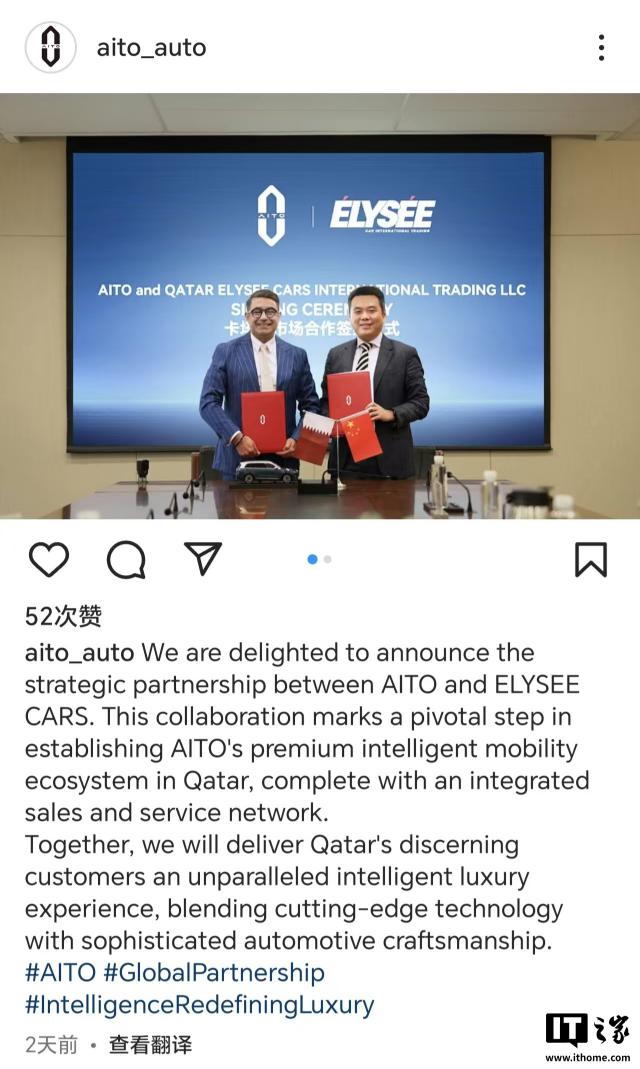 IT 世家 3 月 9 日消息,AITO 本月,问界发布了一份公告 ELYSEE CARS 达成合作,官方表示,此次合作是在卡塔尔建立一个完整的销售和服务网络 AITO 高级智能移动生态系统关键一步。