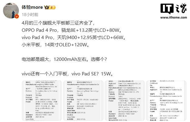 只待 4 月发布,OPPO、vivo、小米三大旗舰平板三证齐全