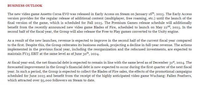 Digital Bros 根据财务报告业务展望一栏,预计集团财务债务改善将在下一财年第一季度(2025年 年 7 月 1 日 -9 月 31 日)事情发生了。在此期间,集团预计将收取《火焰之刃》的销售费用,以及 2025 年 6 月度计划的营销活动效果从期待已久的电子游戏《明末:渊虚之羽》中受益,这款游戏在 Steam 到目前为止,它已经被超越了 95,000 名关注者。