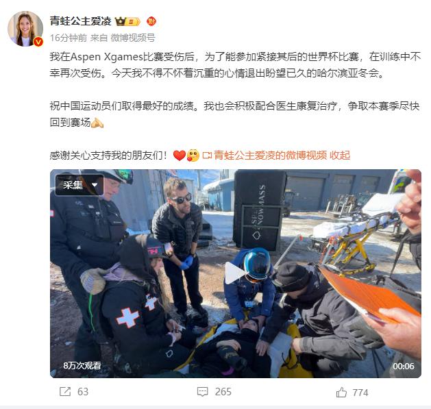 2 月 4 一天下午,中国选手谷爱凌 @爱凌,青蛙公主 宣布因伤退出哈尔滨亚冬会比赛的微博。