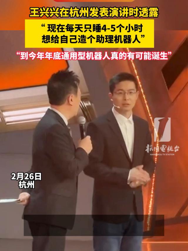 根据杭州电视综合频道的报道,王兴兴透露,他现在每天只睡觉。 4-5 一小时后,“我甚至希望自己能成为一名个人助理,帮助自己做点什么。”他还表示,今年年底相对普遍的人形机器人确实有可能诞生,"真正释放大家的生产,让普通百姓不必做些辛苦的事。"