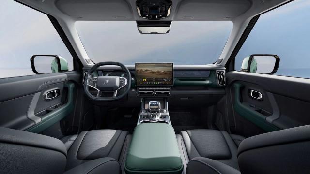 内饰设计采用简约而坚韧的风格,非常符合这款车的定位,木饰板和软包提升了豪华感。中控台配置 15.6 搭载英尺大屏幕 8155 芯片。四门自由车窗 前挡风玻璃全部采用双层夹层玻璃,整车窗 99% SPF100紫外线阻隔 级防晒。座椅具有通风、加热、记忆、副驾驶腿托等功能,车内还配备了通风、加热、记忆、 50W 无线快充和 60W Type-C 配置快充等。