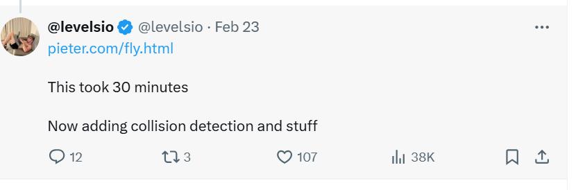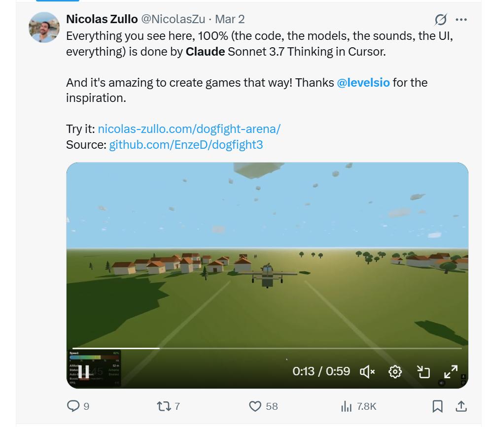 经进一步优化,他自己也惊呆了:“我从来没有玩过游戏,但是只是用了。 Cursor,花了大概 3 在一个小时内,制作了自己的飞行模拟器!只要告诉它我想要什么!”