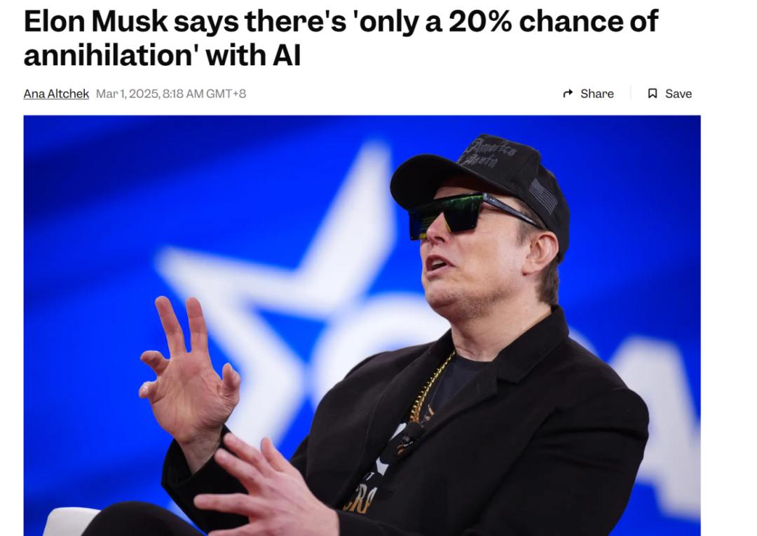 最近,马斯克大胆预测:“5 年内 AI 2029年超越人类总智能, 年度文明终结的可能性高达 20%!”