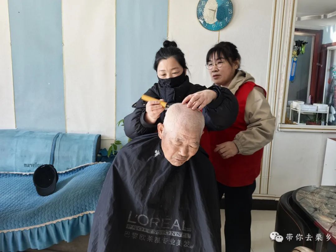 女志愿者携带自己的理发工具,深入村里的老人家中,为村里的老人理发负责。活动期间,志愿者们小心翼翼地为老人梳理头发。在志愿者们巧手的装饰下,老人凌乱的头发变得干脆利落,整个人充满了活力。为了调节气氛,志愿者们在和老人聊天的同时,为老人理发,让他们感到温暖。