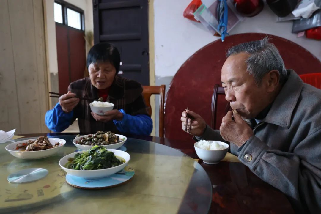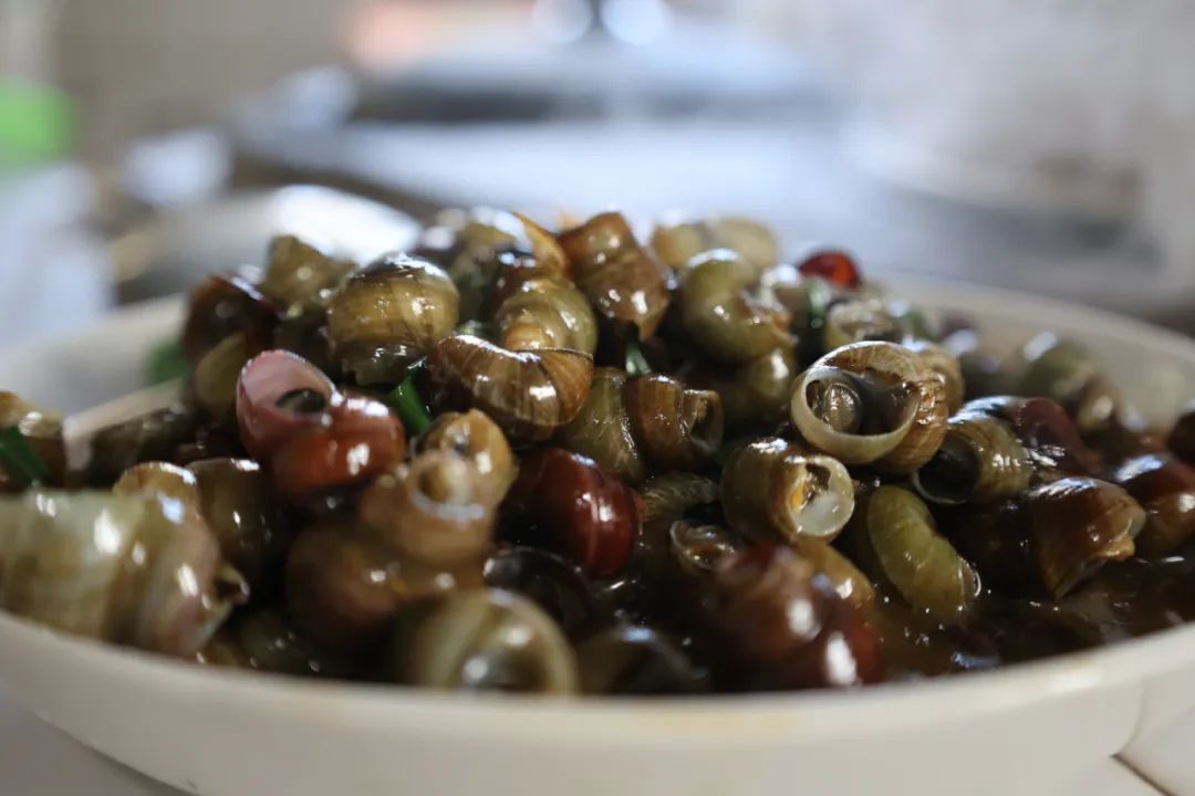 出锅装盘后,螺蛳浸泡在琥珀酱中,壳口微微绽放,隐约透露出诱人的螺肉。沈阿姨的妻子早就摆好了餐具,两人一边吃着这条春天的河鲜,一边唠叨着家常。他说:“小时候,每到这个季节,家家户户都会去河边蜗牛,孩子们也跟着岸边玩,那景色非常热闹。”沈阿姨的妻子一边说着螺蛳,一边感慨道:“那时候螺蛳是餐桌上不可多得的荤菜。现在生活条件好了,但是螺蛳炒出来的美味还是让人念念不忘。”