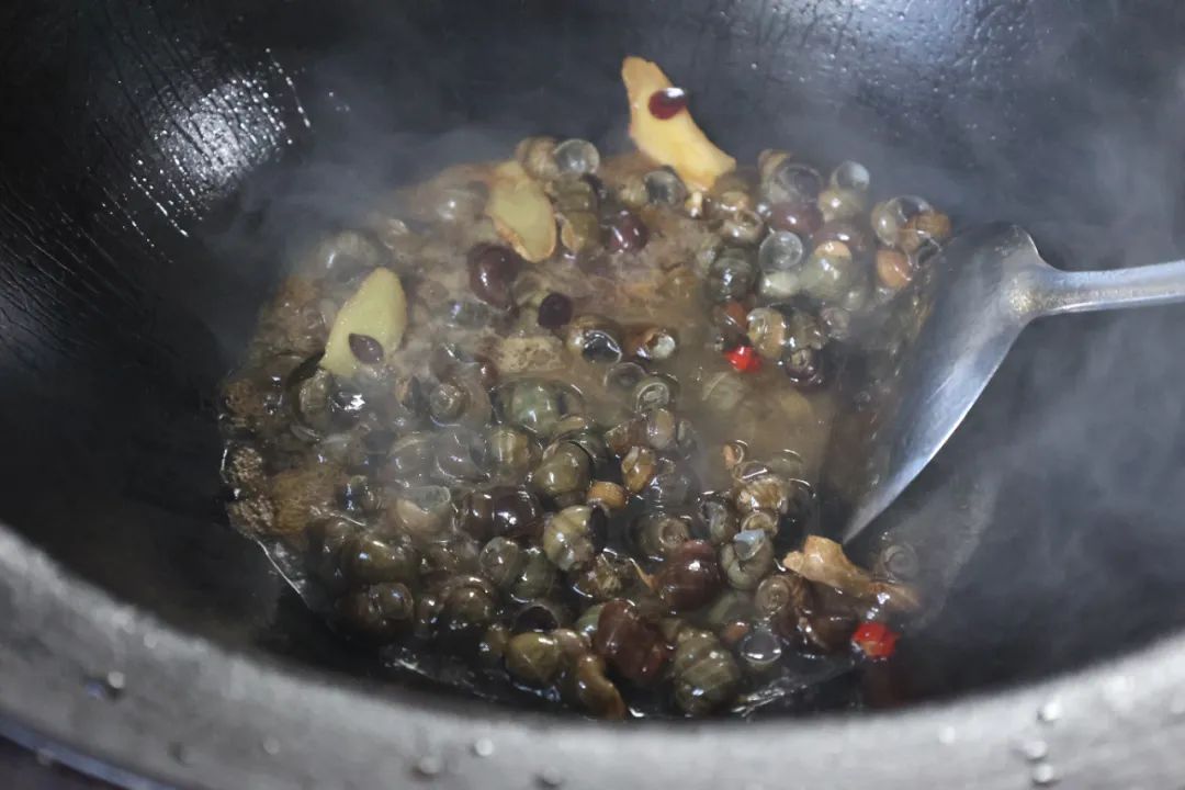 姜片、大葱片、辣椒片...随着炉子里的柴火越来越旺,铁锅里的金黄色菜籽油散发出细腻的油花,沈阿姨干净利落地放入姜、蒜、辣椒等香料中爆香。"闻到香味后,就可以倒入螺蛳猛火炒了。“我看到沈阿姨炒了一会儿,就开始加酱油、酱油、白糖等调味品来提神。然后一碗米酒沿着锅倒下,灶房里突然冒出醇厚的雾气。"此时千万不要加水,要让酒味把腥味全逼出来,最后盖上盖子,炖5分钟收汁后就可以出锅了。”