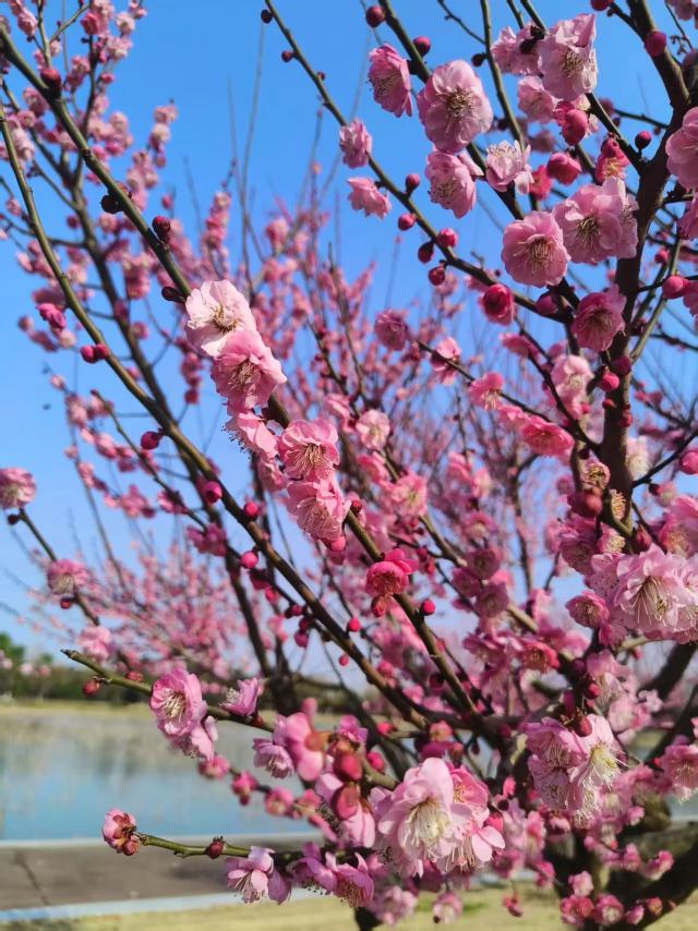 春天寒冷,经济开发区的梅花正以三条长街为轴,描绘出触手可及的春天诗意。鼎源路的白梅如雪,东升港路的临水花影摇曳,鼎松路的梅枝伸展。红梅和白梅在步道边交织成一条流动的春光丝带,燃烧着赤霞和明亮的霜雪。