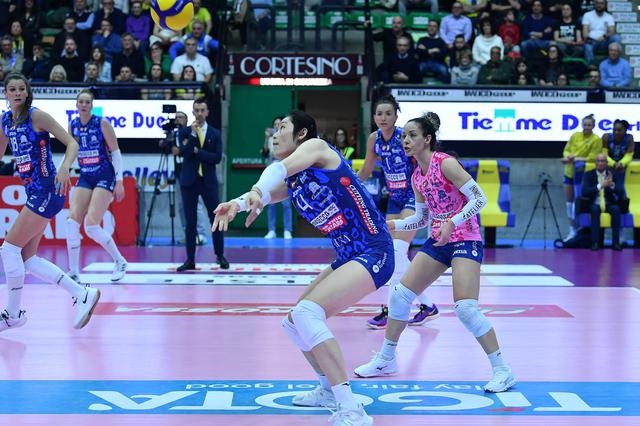 女排意甲联赛 1/4 决赛选择三场两胜制。科内利亚诺是常规赛的冠军, 8 进 4 在较量中迎战排名第一 8 贝加莫。面对意甲和欧冠双线作战,科内利亚诺女排的阵容略有保留,首发派出主攻朱婷(中国)。、副攻卢比安、齐里切拉、哈克(德国)、二传关菜巳(日本)、自由人德吉纳罗等加比(巴西)。
