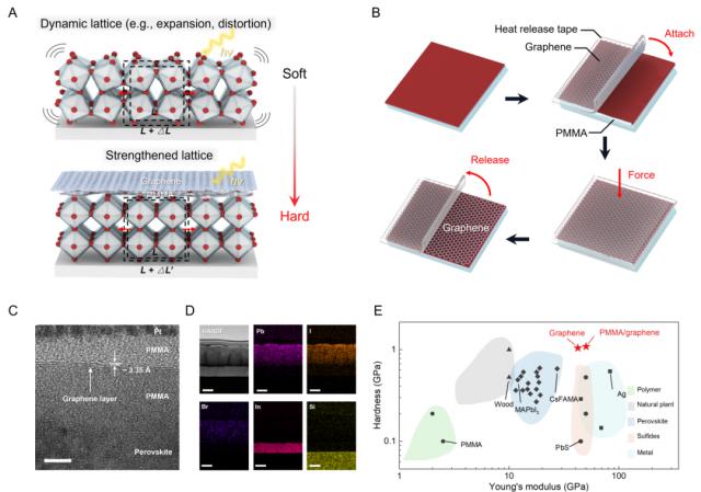 ▲ 石墨烯 - 高聚物藕合两层界面结构,实现钙钛矿薄膜材料,兼顾高韧性、高耐磨性和优异的电荷运输特性。