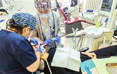 张锦苹(蓝衣)和助手正在治疗病人的牙齿。记者 刘波 摄