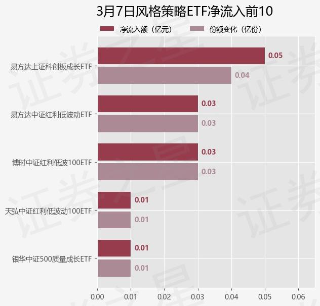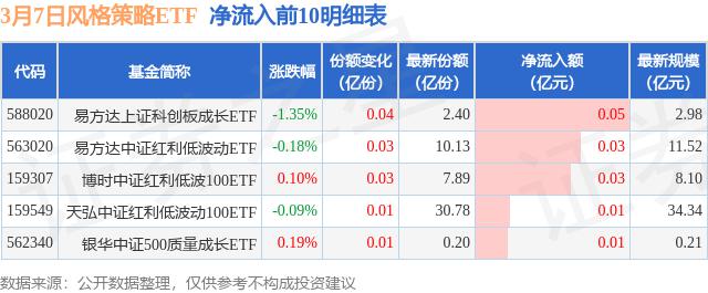 当天有 5 只风格策略 ETF 资金净流入显示,其中E基金净流入排名第一的是E基金上证科技创新板成长 ETF(588020),份额增加 400.0 万份,净流入额为 497.35 万元。