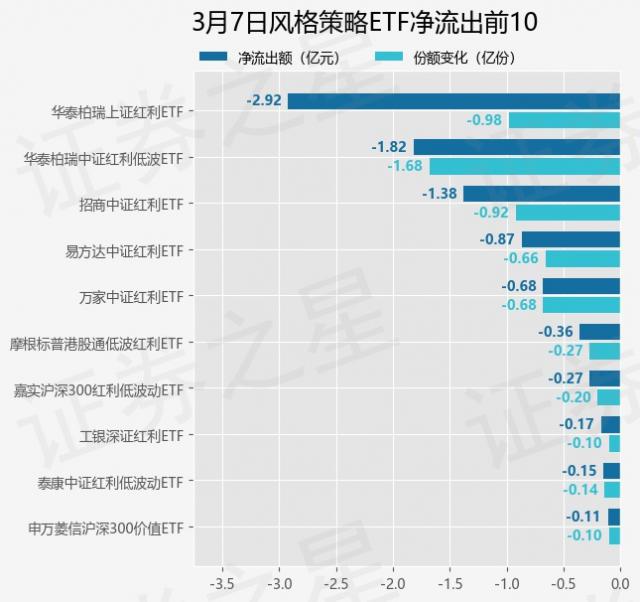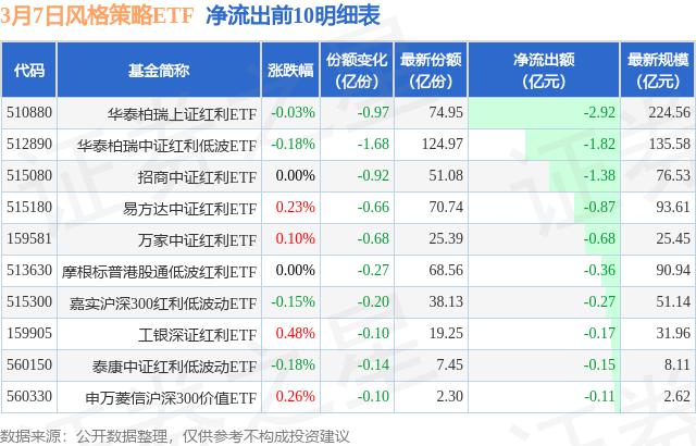 当天有 28 只风格策略 ETF 资金净流出,其中华泰柏瑞上证红利排名第一。 ETF(510880),份额下降 9750.0 万份,净流出额为 2.92 亿元。