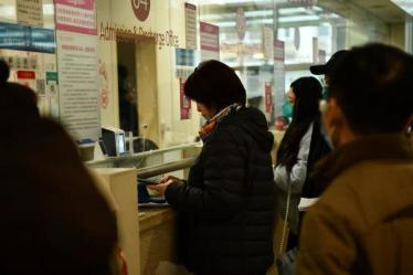 2024年3月4日,在北京朝阳医院出院交费窗口前,许多病人正在等待直接结算。曹子豪摄