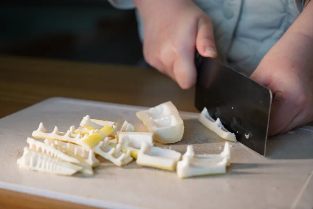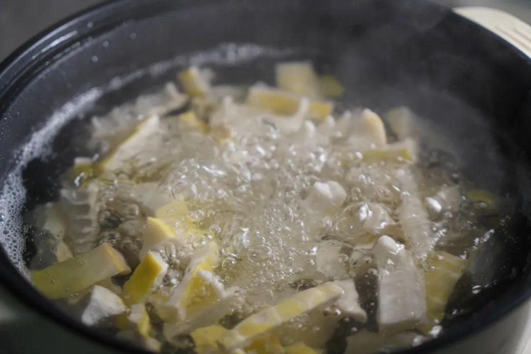 竹笋剥壳切丁,滚水焯去涩味,保持春天山林中的清新。