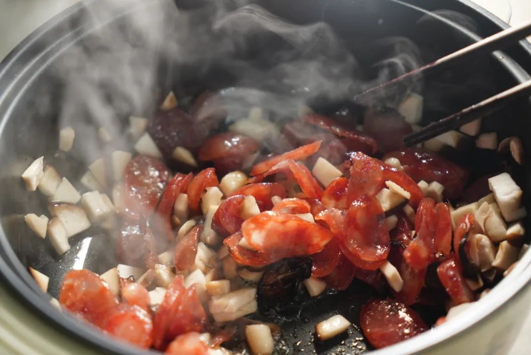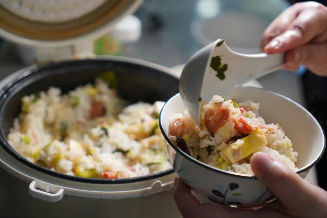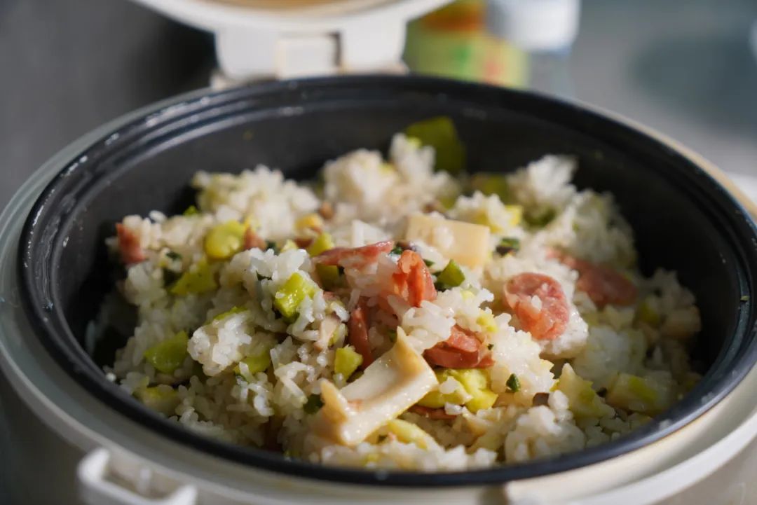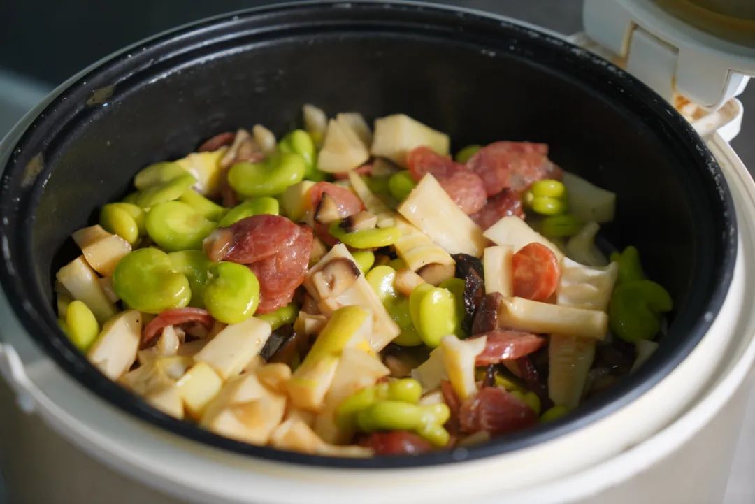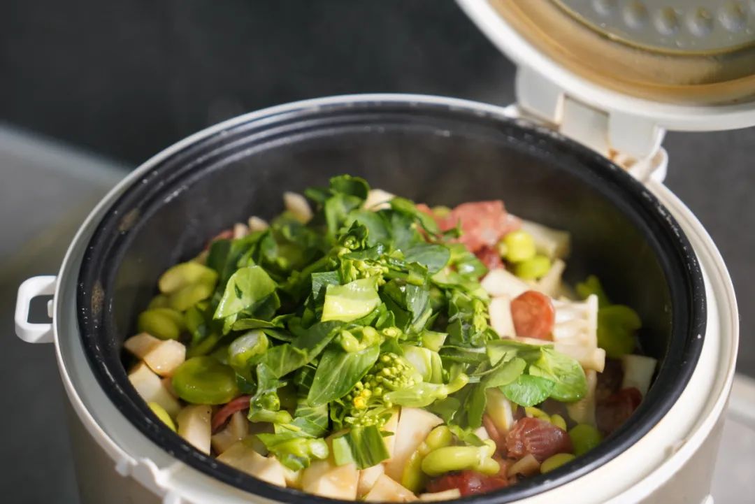 最后菜心轻铺表面,电饭锅一键锁住春色。