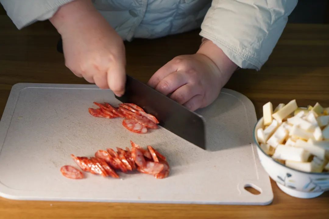 香肠斜刀切片,冬天腌制的脂香特别浓。红色和白色的片状在热锅里卷起,逼出棕色的油脂。