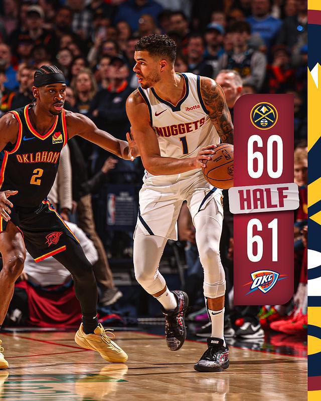 进入第二节比赛,双方的进攻火力都在升级,两队每节都在轰下。 30 得分进行对攻。第二节,约基奇受到限制,仅仅依靠罚球获得。 1 分,布劳恩爆发成为掘金奇兵,他每一节都是 8 分钟 7 中 5 获得 13 分。在亚历山大的带领下,雷霆进行了对抗,双方不断地咬着比分拉锯战,雷霆在第二节还剩下。 3 分 24 秒,渐渐地以 56-47 反超掘金 9 分。掘金也是再一次咬住比分,雷霆每节 33-31 净胜 2 得分,前半段结束雷霆 61-60 反超掘金 1 分。