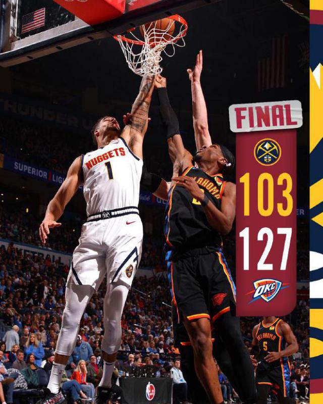 掘金:波特 24 分 15 板、约基奇 24 分 13 板 9 助 3 帽、布劳恩 19 分 3 板 2 助、穆雷 17 分 2 板 4 助、威少 4 分 11 板 5 助、戈登 5 分。