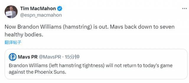 此后,独行侠正式宣布布布兰登。 - 威廉姆斯也退出了比赛,问题是左腿肌肉紧张。MacMahon 在分享官方伤病报告后,他写道:“随着布兰登 - 威廉姆斯的伤退,独行侠只剩下一个。 7 著名的健康球员。”