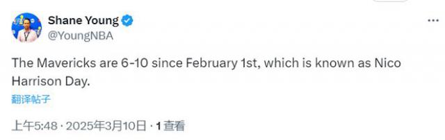 名记 Shane Young 别忘了打开对哈里森的讽刺。他写道:“自打 2 月 1 到目前为止(当地时间),独行侠的记录是 6 胜 10 负面,而那一天是众所周知的“哈里森日”。 Young 提到哈里森日,就是东契奇独行侠交易的日子。他的魔咒还在继续。