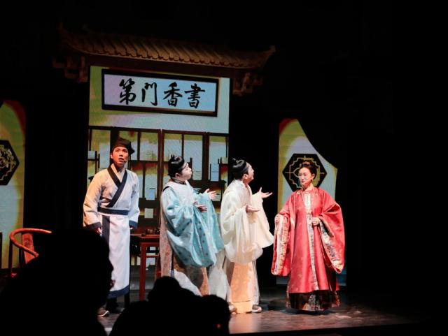 演出现场,新版《桃花庵歌》传出,剧中演员与市民游客互动,唐寅 IP 这种超级符号衍生出一种可触摸、可体验、可消费的文旅商体展新景象。