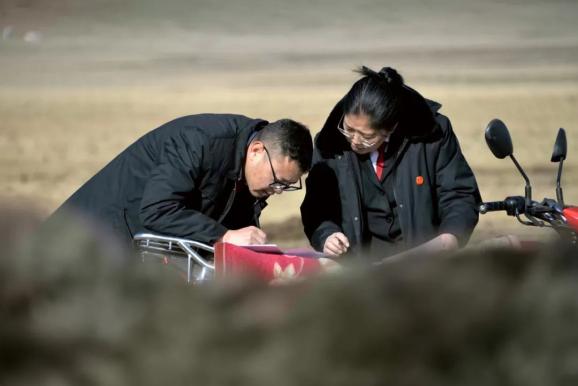 李小春(右)记录了四川省若尔盖县人民法院法官刚刚实施的案件。
