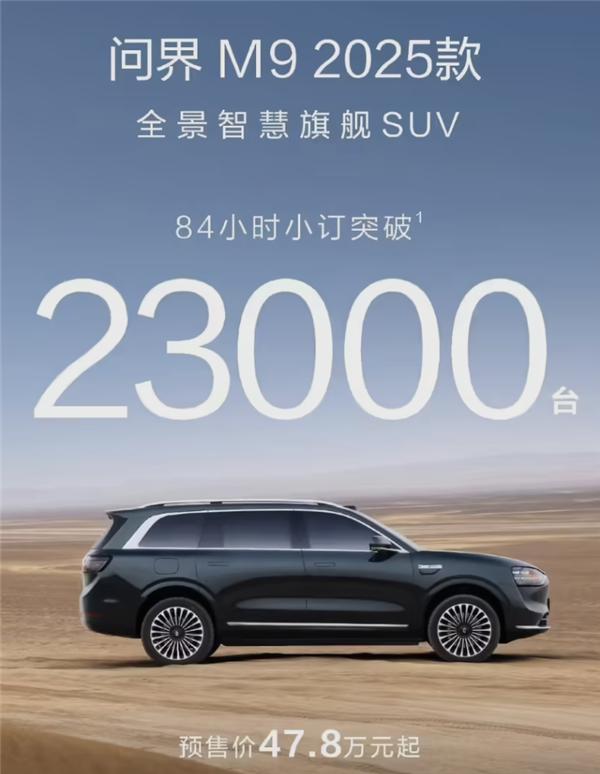此前,问界 M8 在 1 订单在一小时内突破 7500 台,6 小时订单破 2.1 万台,12 小时订单达 2.8 万台;问界 M9 在 1 订单在一小时内突破 3800 台,6 小时订单破 1.1 万台,12 小时订单达 1.35 万台。